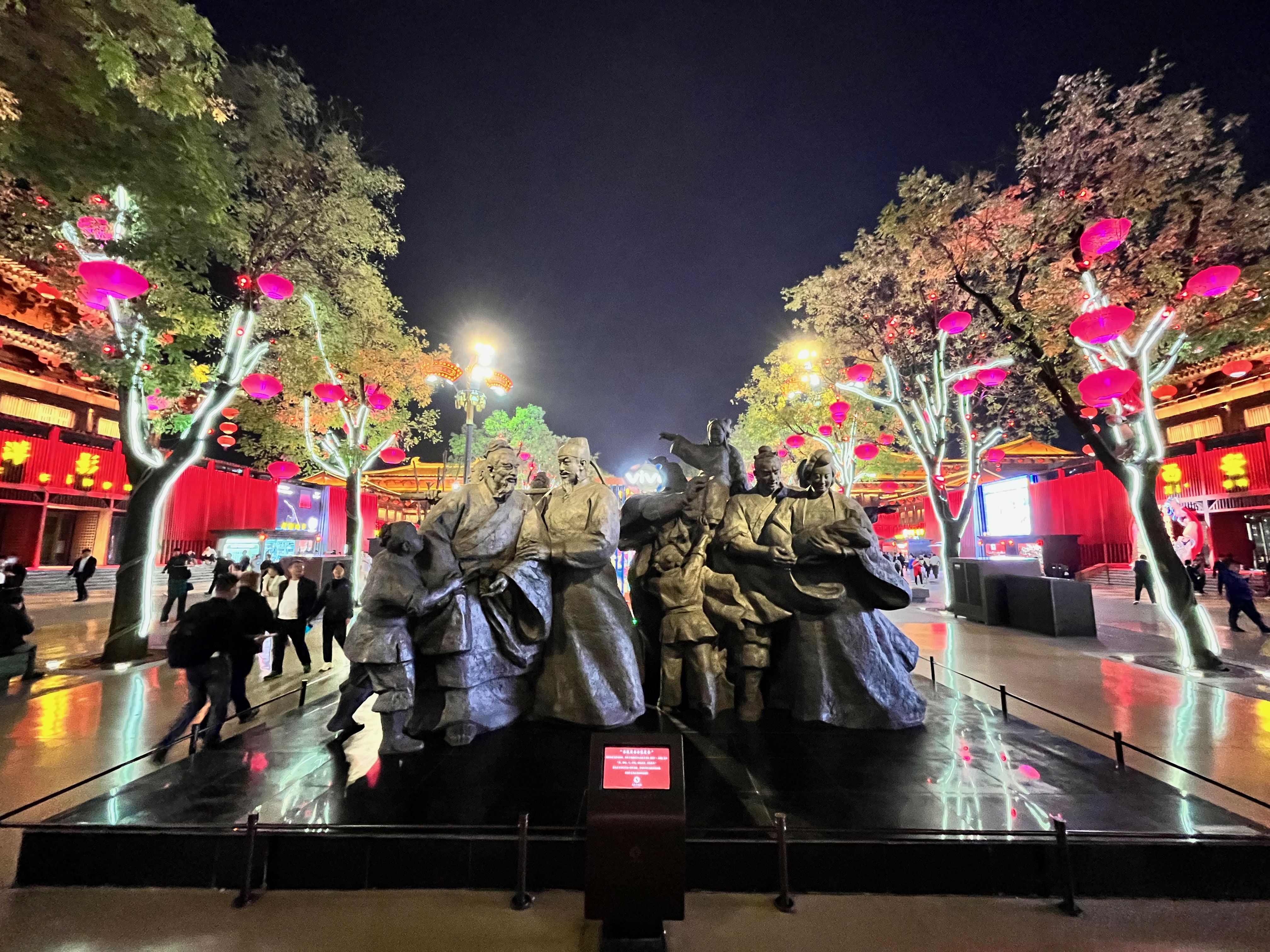 In one of the surrounding buildings, an intricate wooden carving of The Journey to the West.